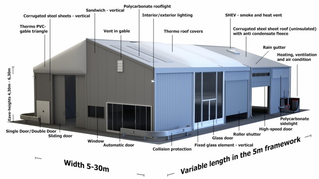 Our insulated industrial buildings are built in 5m wall sections. This allows you to specify your building length in 5m increments that is limited only by the space you have.