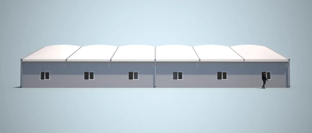 The 12m x 30m ICE module is our solution for temporary accommodation, medical stations, and evacuation facilities. With an area of 360m², a clearly structured room layout and integrated building services, this structure provides comfortable mobile operations support quickly and efficiently.