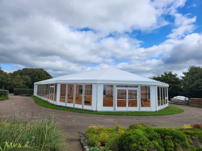 The semi-octagonal gable end is made up of four segments each 5m wide. While this tent is mostly equipped with clear window sections, slots for solid wall panels give flexible design options.