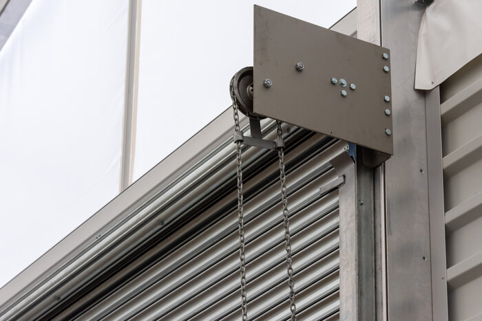 For extra support and building rigidity, steel wires and support beams run between the eaves for maximum load-bearing capacity. The building is designed for wind loads up to 0.5kN/m² and snow loads of 88kg/m². Outside, rain is collected from the roof by galvanized rain gutters with downpipes on both long sides of the building.