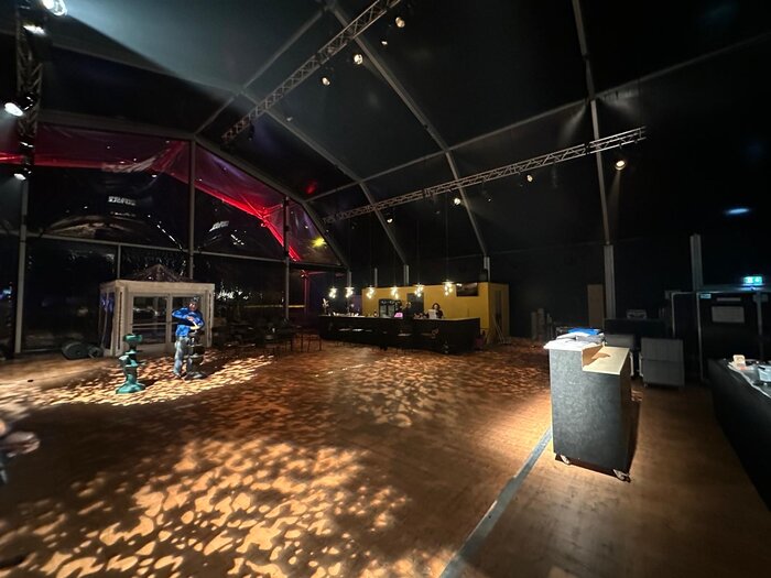 Optimized acoustics are produced in the polygon-shaped structure which is 20m wide, 65m long with a 4m eave height. The event building features a custom-designed, black and white, air-filled roof and insulating sandwich side panels. Additionally, the transparent Polyglass roof membrane allows light through for a bright atmosphere.
